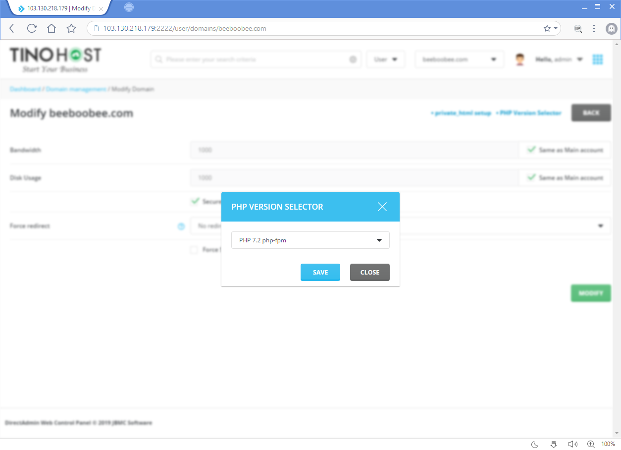 Bây giờ bạn có thể chọn một phiên bản PHP cho mỗi trang web. Tất cả các trang web hiện đang chạy trên máy chủ DirectAdmin của bạn sẽ sử dụng phiên bản PHP đặt cho php1_release. Để thay đổi phiên bản PHP cho mỗi trang web, đăng nhập vào DirectAdmin ở cấp người dùng, nhấn Domain Setup, chọn tên miền cần thay đổi phiên bản PHP và kéo xuống dưới. Như thể hiện trong hình bên dưới, bây giờ bạn có thể chọn một phiên bản PHP. Lưu ý sau khi thay đổi phiên bản PHP, có thể mất đến 1 phút để xử lý thay đổi.
